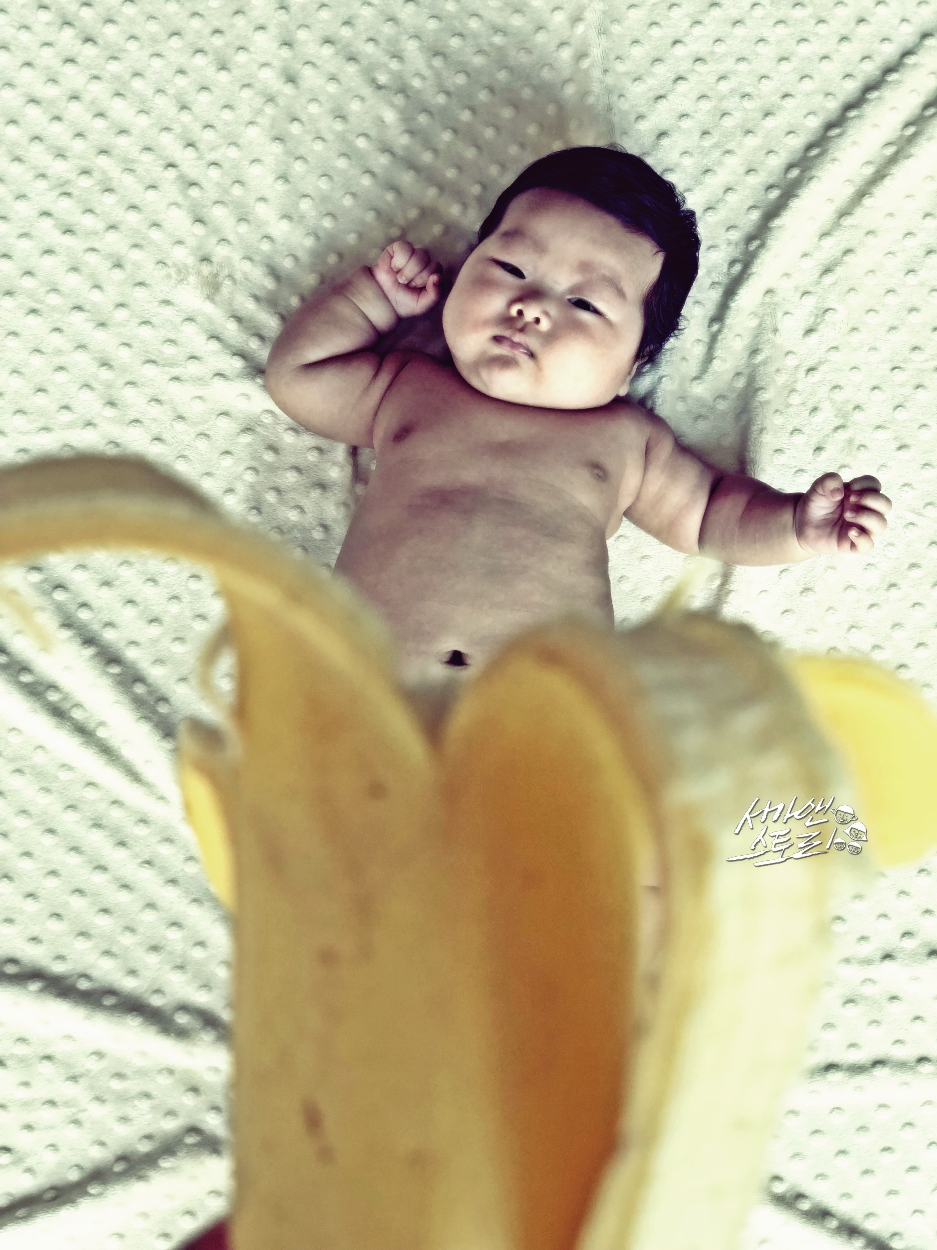 ↗바나나 속살처럼 달콤하고 부드러운 너인지라 엄마는 언제나 네 앞에서 녹아버리네. 너의 미소 한 번에, 까르르 소리 한 번에 가슴이 콩닥콩닥. 피곤도 싹 달아나는 것 같아. 이쁘다, 이뻐!