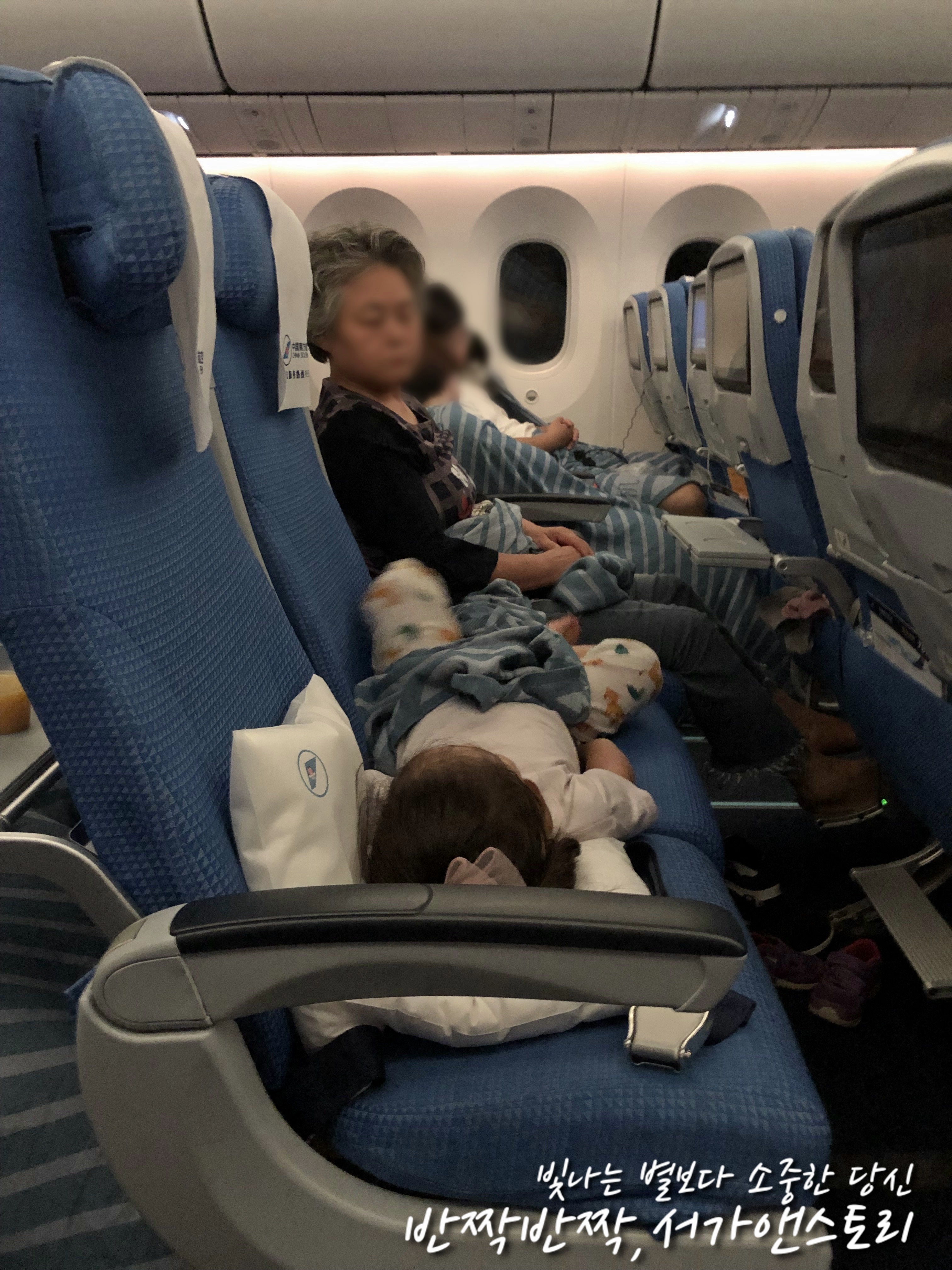 ↗깊은 밤시간이라 아이들은 비행기에 타자 마자 곯아떨어졌습니다. 의자에 앉아서 편히 자기 힘들면 어쩌나 걱정했는데 다행이 제 옆자리가 비어있어서 큰 아이도, 둘째 아이도 좌석 두 개 위에 편히 누워 잠을 잘 수가 있었답니다. 우리 막내는 제 무릎 위에 누워서 밤새 평안히 잘 잤지요. 비행기가 이륙하고 착륙할 때 막내가 너무 심하게 울어서 계속 그럴까 봐 걱정했는데 잠깐 울고는 그쳐서 잘 자고 잘 먹으며 다른 승객들에게 불편을 끼치지 않고 어린 아이들 셋과 함께 밤을 잘 보내서 참 감사했답니다.