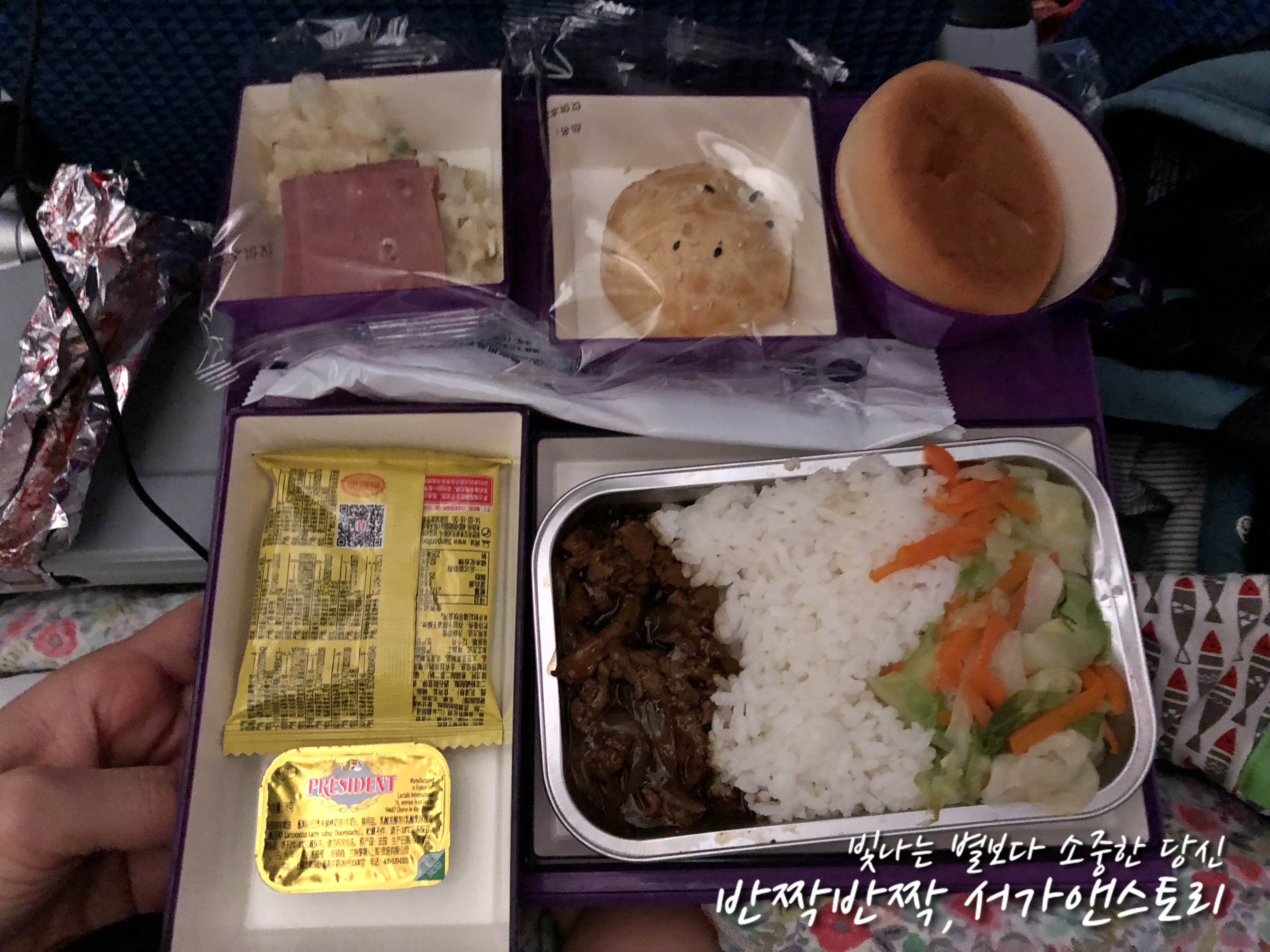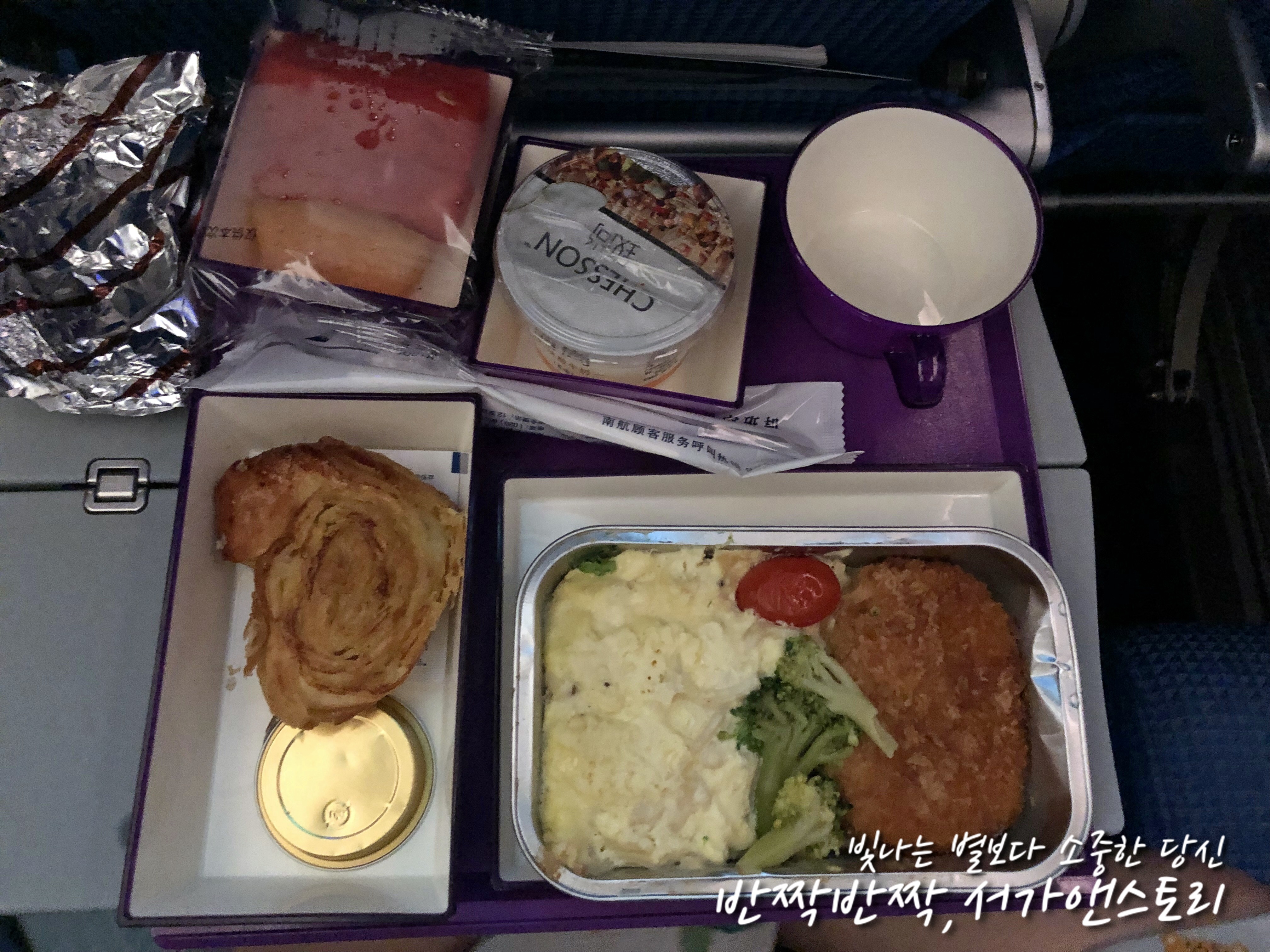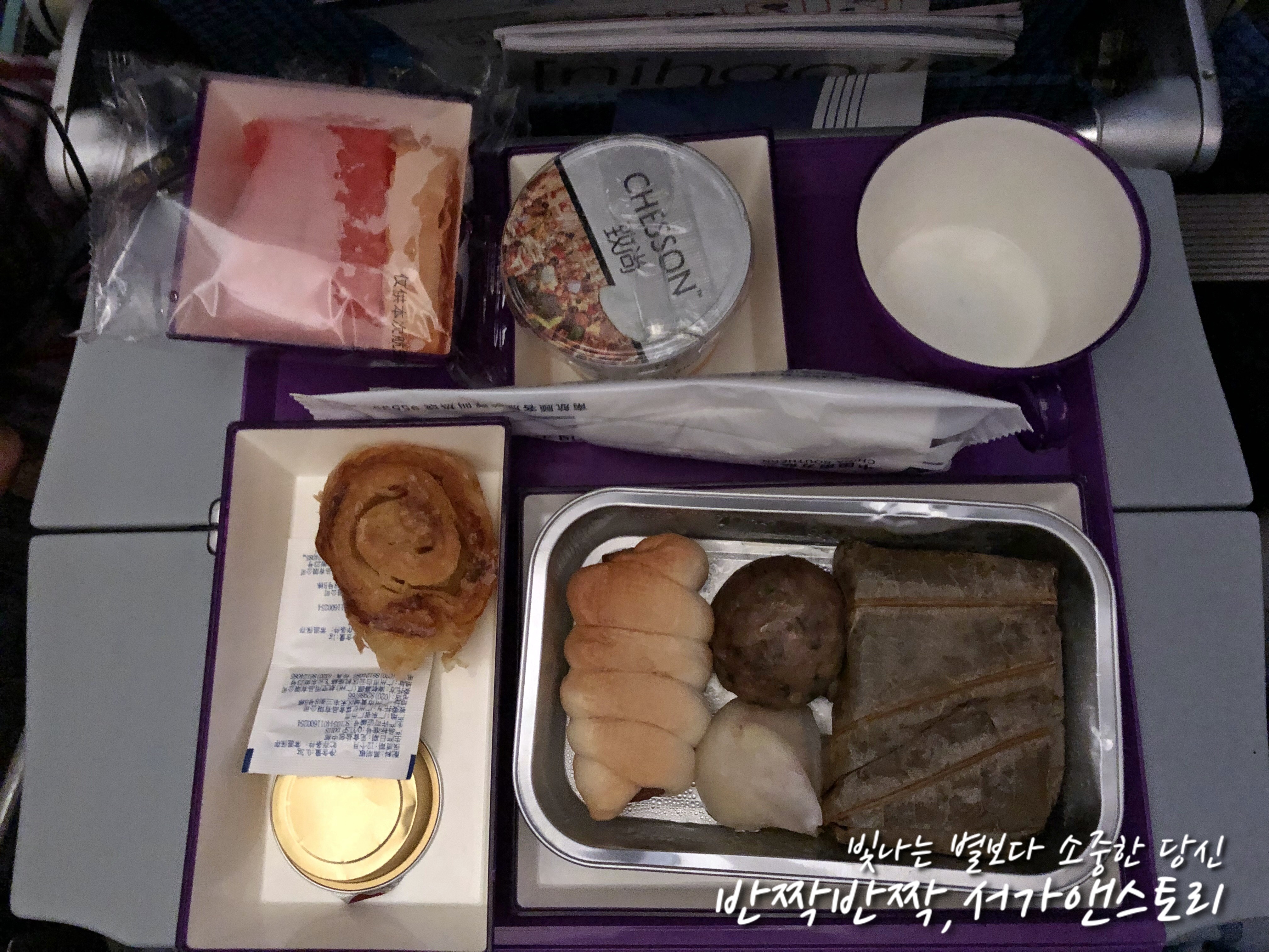 ↗이른 아침에 받은 기내식이었어요, 소고기야채볶음이었는데 인천에서 광저우로 갈 때와는 또 다른 맛이었답니다. 이번엔 더욱 향신료 맛이 강하다고 해야 할까요. 아이들은 결국 입에도 대지 않고 빵만 먹었답니다. 사실 제 입에도 소고기보다는 양념없이 그냥 찐 야채가 달콤하니 더 맛이 좋았네요. 햄은 제 입에도 정말 꽝이었어요, 너무 짜서 맛을 느낄 수도 없을 정도였거든요. 비닐 포장이 되어 있던 빵은 팥소가 가득했는데 너무 달아서 한 입 먹고는 남겨버렸네요.