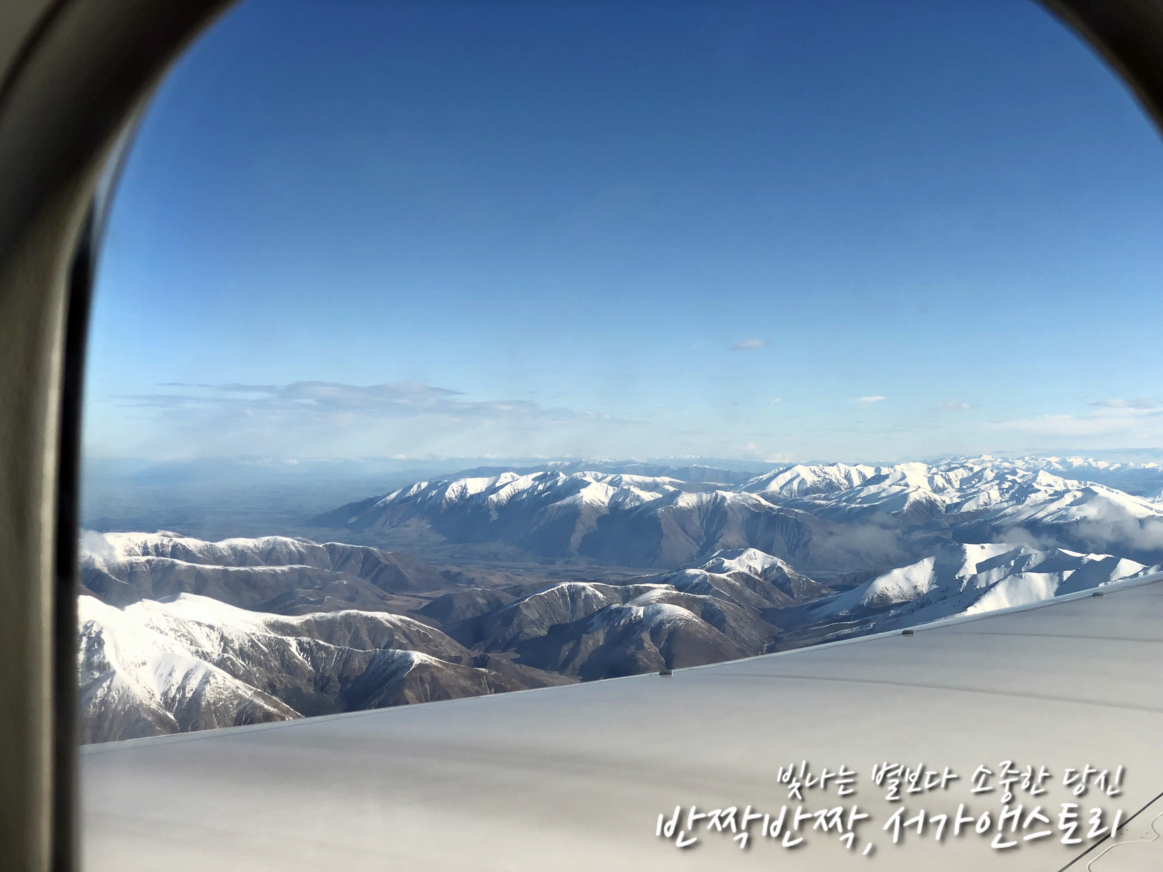 ↗크라이스트처치 상공에서 보인 설산입니다. 흰눈이 가득 쌓인 산이 보이네요. 이제 다 왔구나 그런 생각?