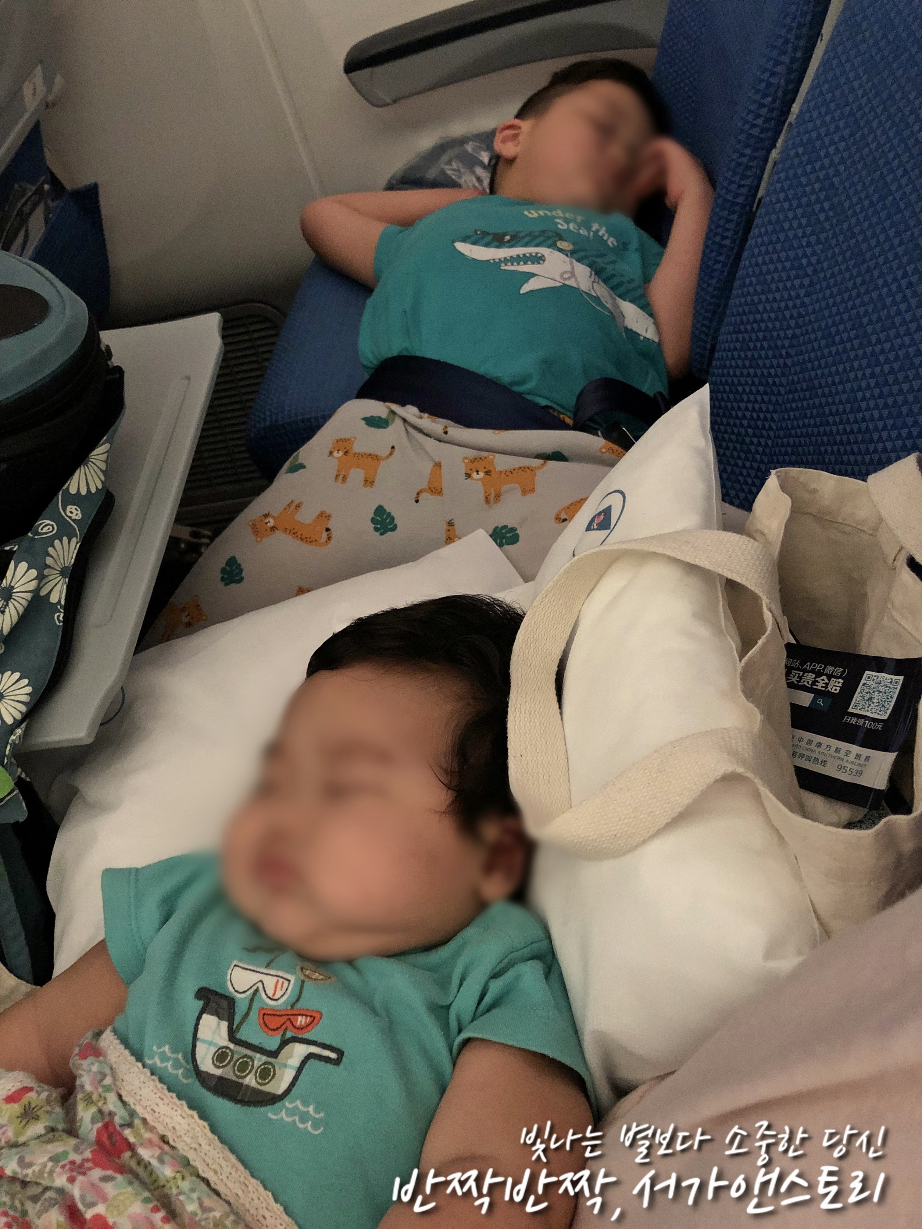 ↗깊은 밤시간이라 아이들은 비행기에 타자 마자 곯아떨어졌습니다. 의자에 앉아서 편히 자기 힘들면 어쩌나 걱정했는데 다행이 제 옆자리가 비어있어서 큰 아이도, 둘째 아이도 좌석 두 개 위에 편히 누워 잠을 잘 수가 있었답니다. 우리 막내는 제 무릎 위에 누워서 밤새 평안히 잘 잤지요. 비행기가 이륙하고 착륙할 때 막내가 너무 심하게 울어서 계속 그럴까 봐 걱정했는데 잠깐 울고는 그쳐서 잘 자고 잘 먹으며 다른 승객들에게 불편을 끼치지 않고 어린 아이들 셋과 함께 밤을 잘 보내서 참 감사했답니다.