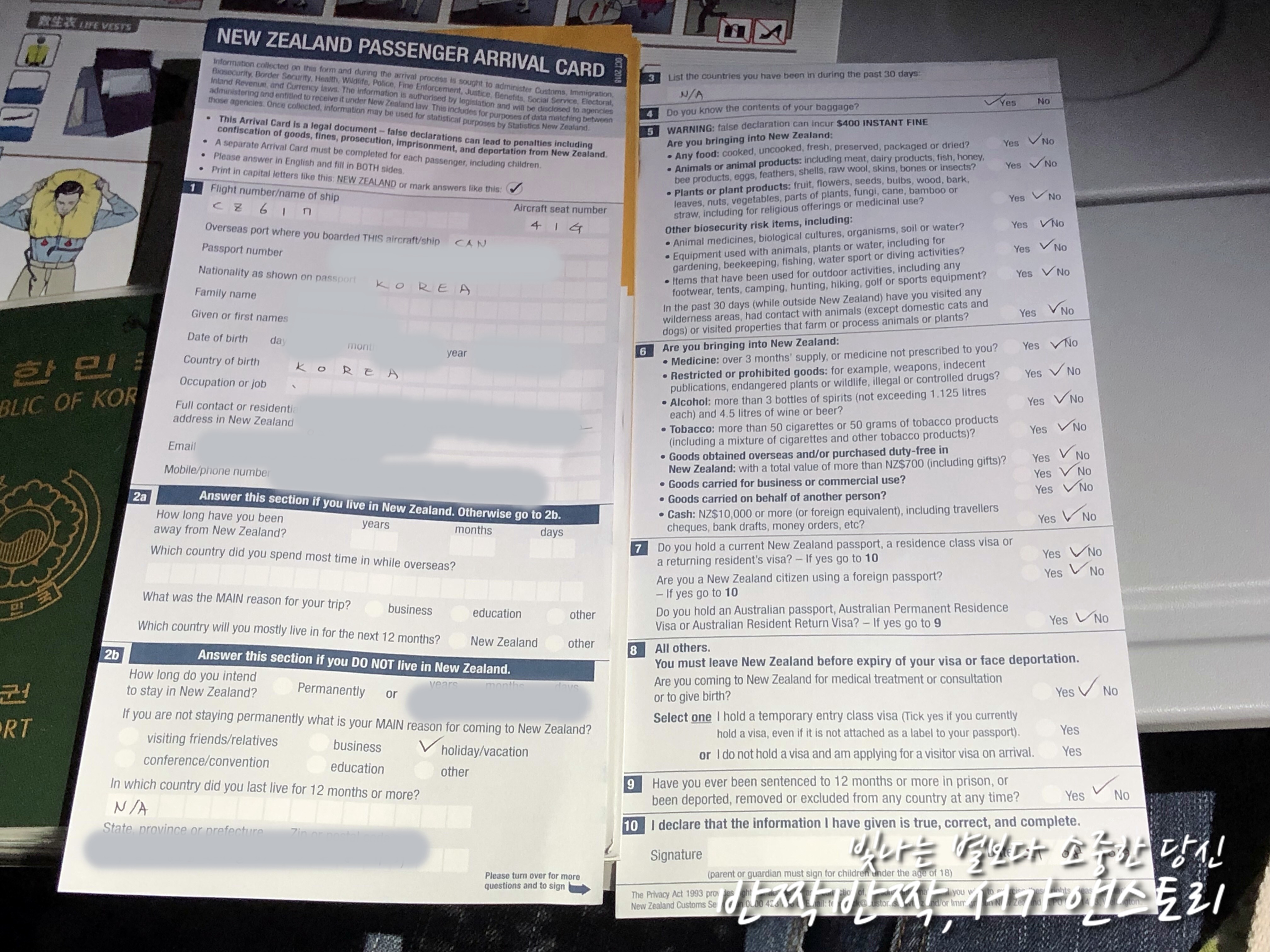 ↗아이들이 아직 잠에서 깨어나기 전에 저는 입국신고서를 작성했어요. 친정엄마와 아이들 셋, 그리고 제 것까지 모두 다섯장을 다 작성해야 해서 아이들이 깨면 정신없을 것 같았거든요. 신고할 것이 없어 [Do you know the contents of your baggage?] 이외에는 모두 [NO]를 체크하면 되었지만 여권 정보를 작성을 해야 했기에 조금 신경이 쓰였답니다.