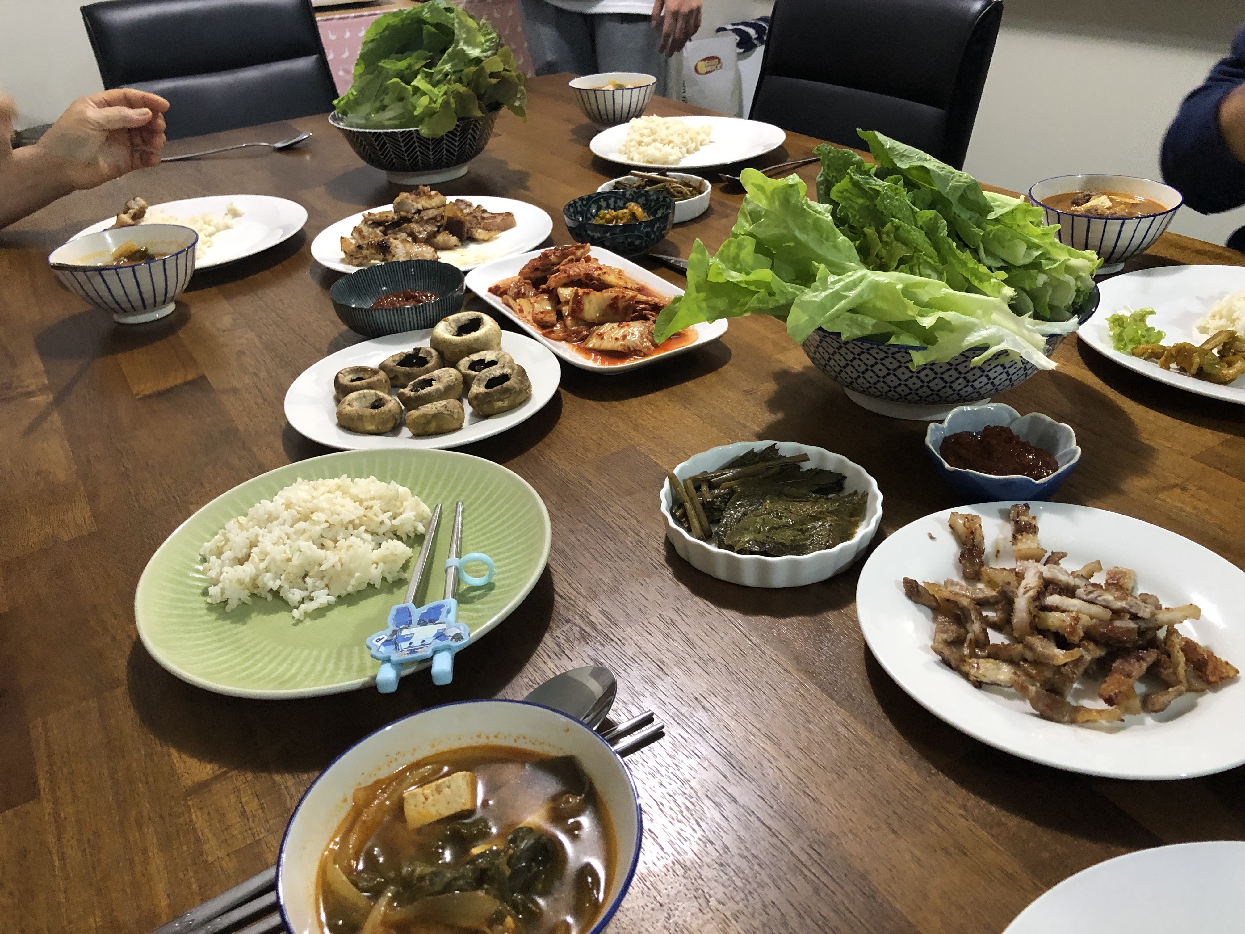 ↗아이들이 새 장난감을 뜯고 놀고 하는 사이 저녁밤이 준비되었습니다. 라면으로 간단히 저녁을 먹었던 어제와는 달리 오늘은 배추된장국에다 구운 삼겹살과 양송이, 그리고 김치와 상추쌈을 먹었답니다. 짙은 여독과 시차로 인해 늦잠을 풀 자버린 오늘인지라 더욱 짧았던 하루여서 쇼핑몰 방문만으로 이 하루가 다 가버렸지만 오늘도 참 감사했답니다. 아이들이 눈부신 햇살만큼 밝게 미소지었던 하루여서 감사했고, 그 누구도 아프거나 다치지 않아 또 감사했고, 사랑하는 가족들과 함께 맛있는 저녁을 함께 나눌 수 있어 감사했답니다. 이 하루로 시차가 적응될리는 없지만 이렇게 하루, 이틀 보내다보면 금새 아침 일찍 가뿐히 일어날 수 있겠죠?