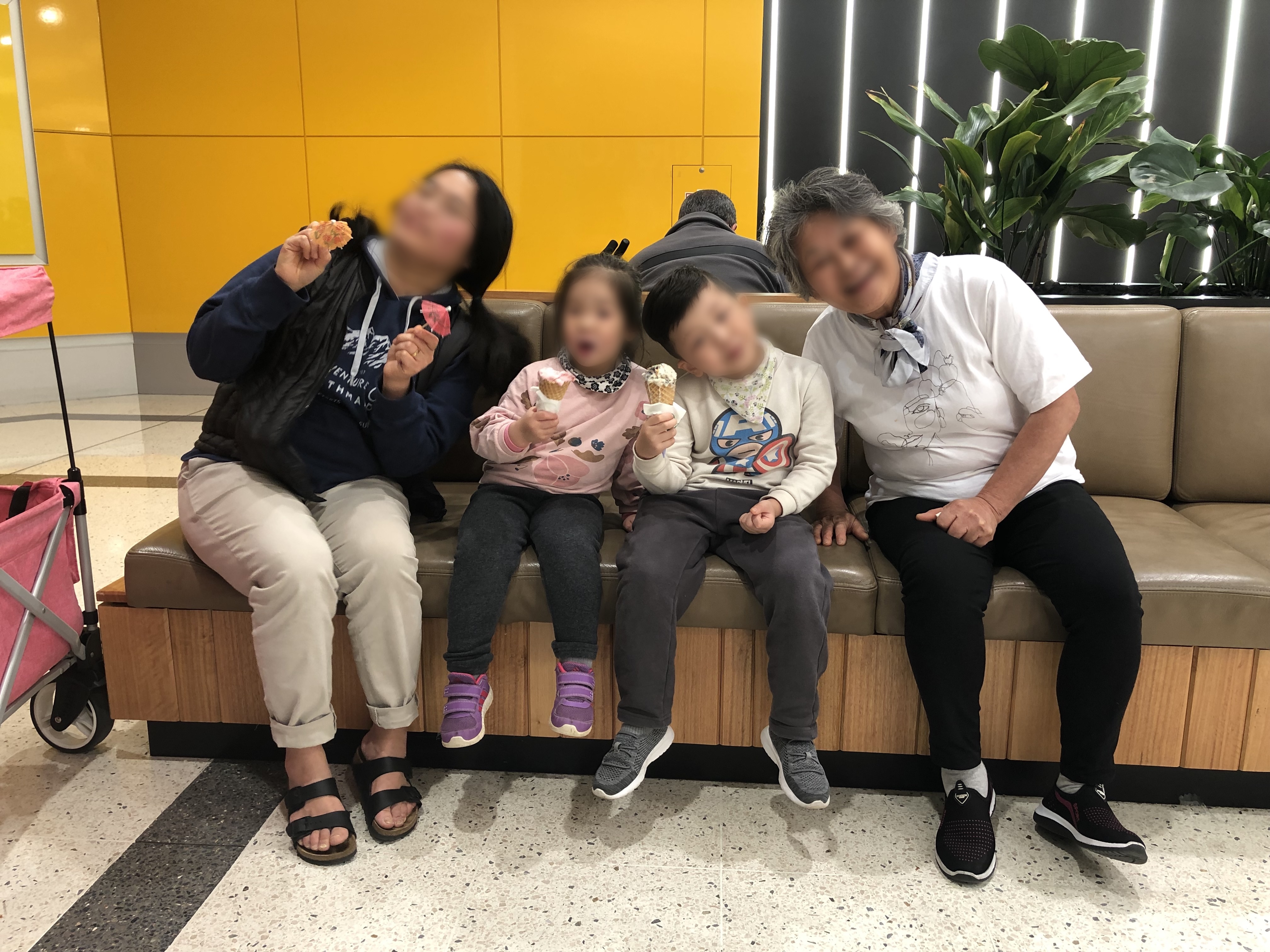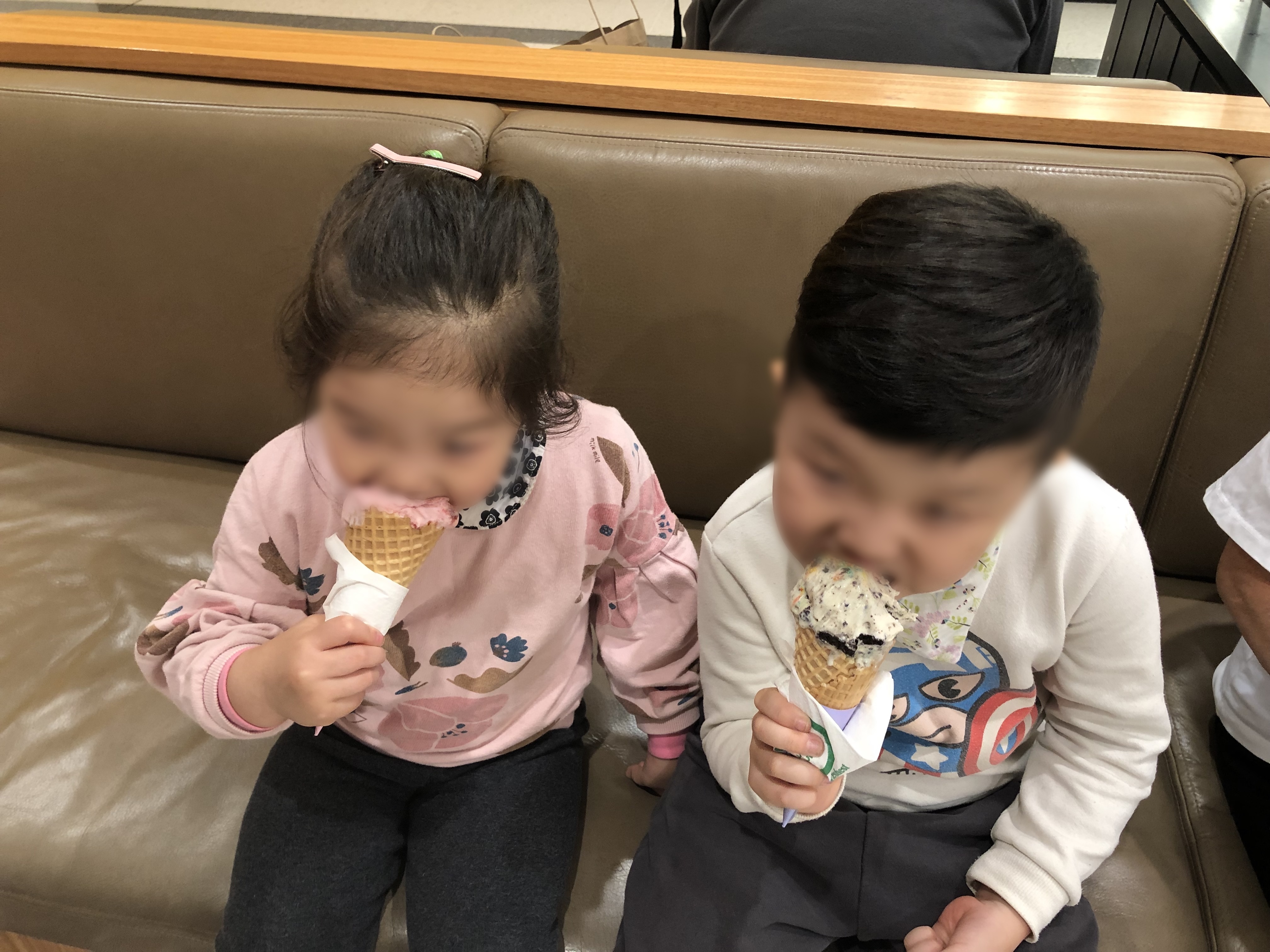 ↗쇼핑몰 이곳 저곳을 찬찬히 둘러보다가 아이들에게 아이스크림콘을 하나씩 들려주었어요, 잠이 온다던 둘째도 아이스크림 이야기에 벌떡 일어나 "딸기맛 아이스크림!"을 외쳤지요. 자기 주먹보다 큰 아이스크림을 손에 들려줬더니 어찌나 얌전히 앉아서 잘 먹던지. 저는 아이들이 맛있게 잘 먹고 있을 때가 참 좋습니다. 잘 먹어서 좋은 것도 있지만, 무엇보다 아이들이 잘 먹을 때가 가장 조용할 때라 말이지요.