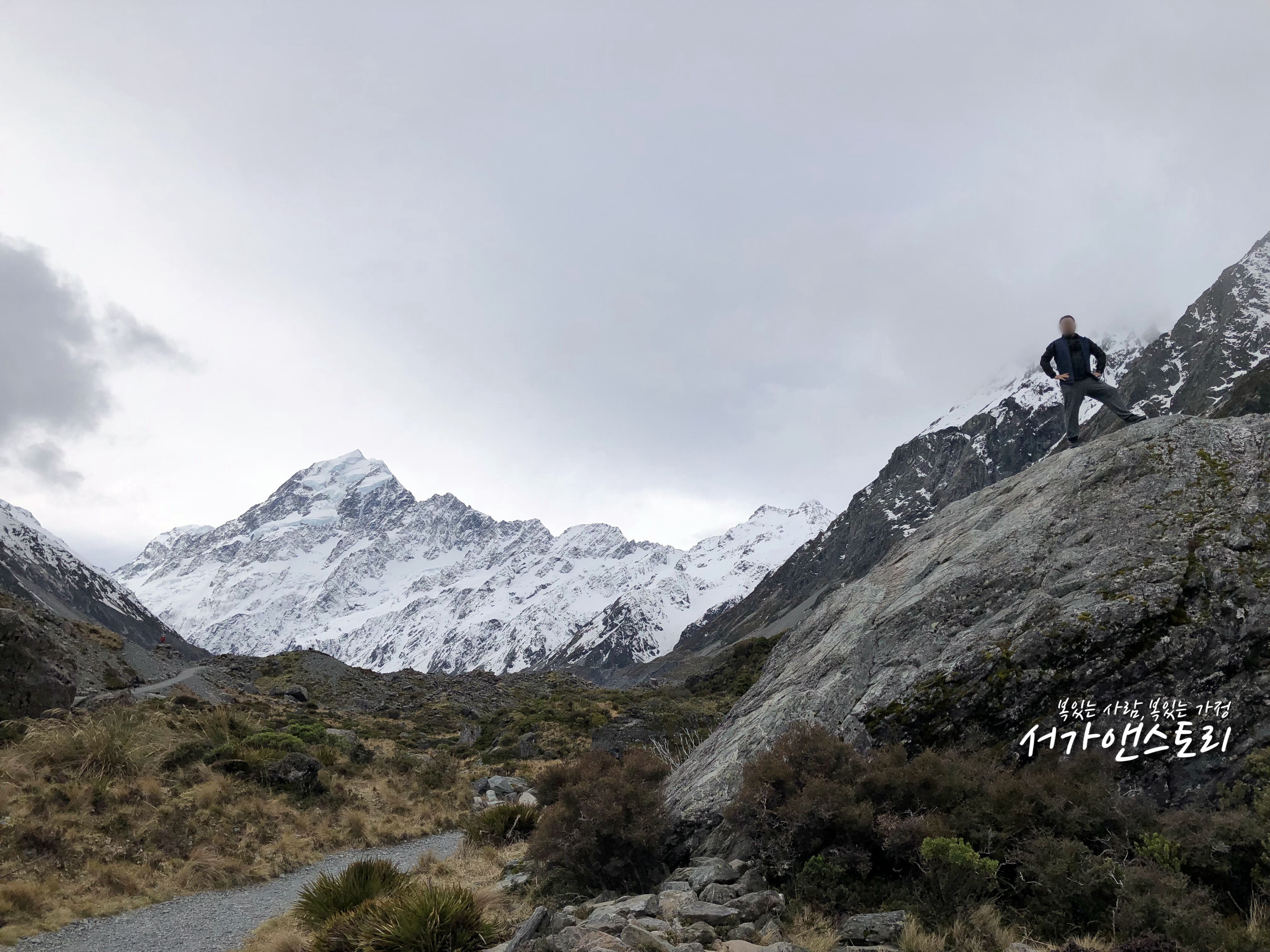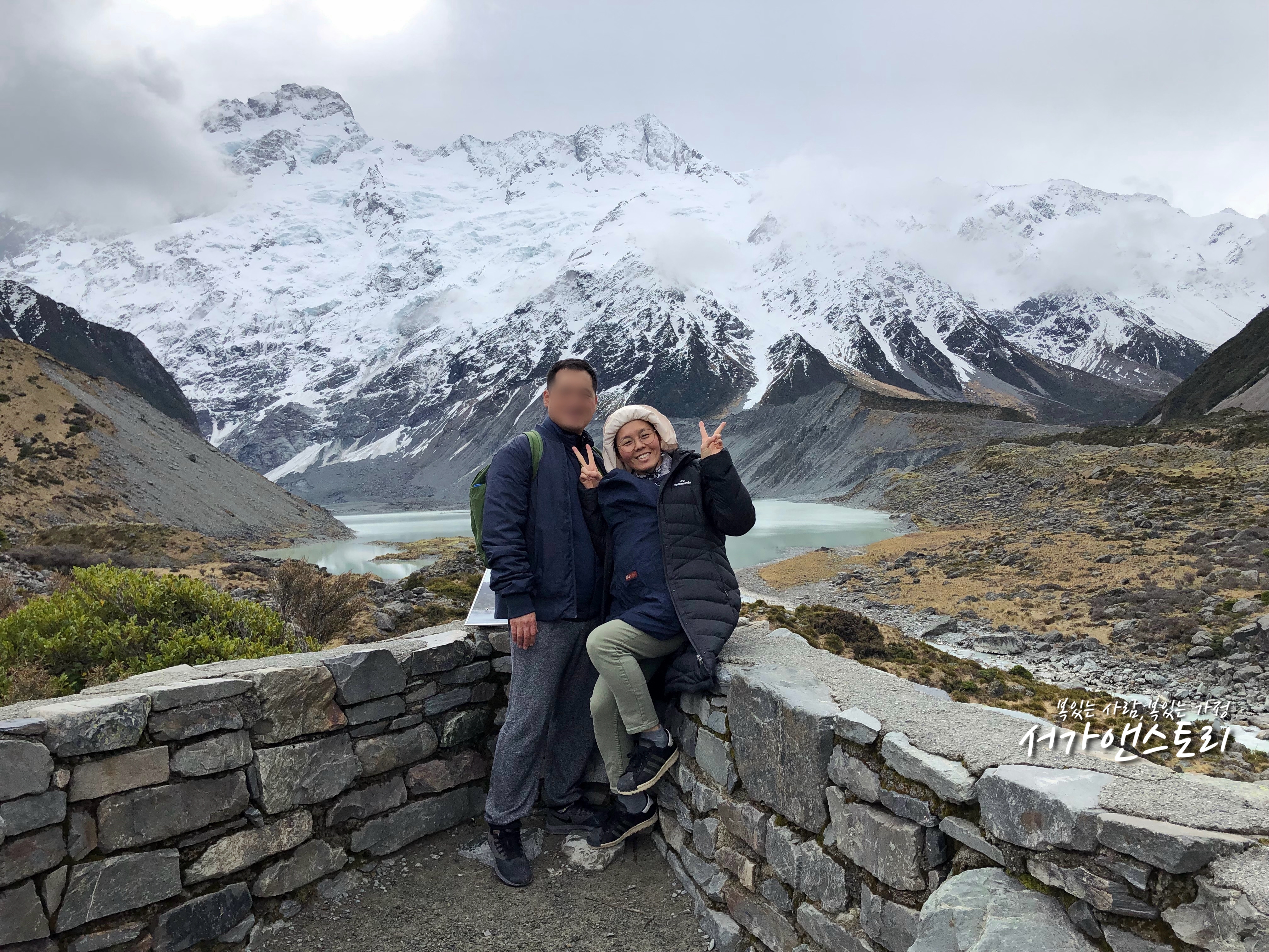 ↗푸카키 호수를 보며 한참을 달렸더니 멀기만 하던 마운트쿡(Mount Cook)이 바로 눈 앞에 있는 듯 했어요, 구름이 가득한 흐린 날이었는데도 산 꼭대기가 어찌나 잘 보였는지 몰라요. 아이들과 함께 폴짝 폴짝 뛰어오르기도 하고 남편과 둘이서만 폴짝 뛰어오르기도 하며 사진을 찍었답니다. 누구보다 잘 뛰어오를 수 있을 거라 생각했는데 쉽지 않았어요.