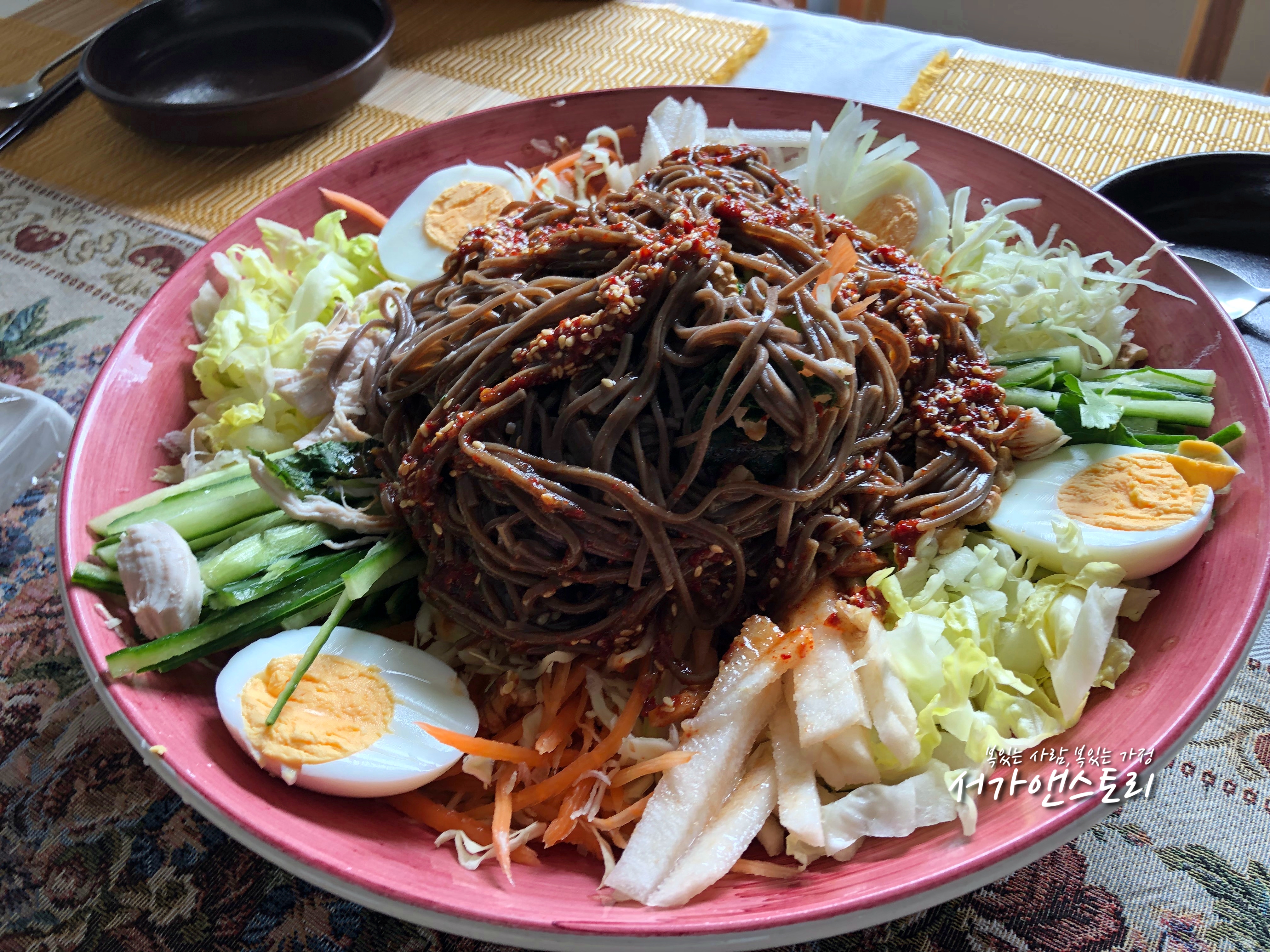 ↗도착해서 보니 식탁 위에는 이미 바로 먹을 수 있도록 음식이 차려져 있었어요. 도착시간에 맞춰서 아침부터 분주하게 음식을 하신 것 같았어요. 오늘의 메인 요리는 갖가지 야채를 곁들이고 새콤달콤매콤한 양념장을 얹어 먹는 비빔국수였답니다. 아삭아삭한 식감에다 삶은 닭고기와 달걀, 견과류까지 올려 먹으니 영양적으로도 부족함이 없었어요.