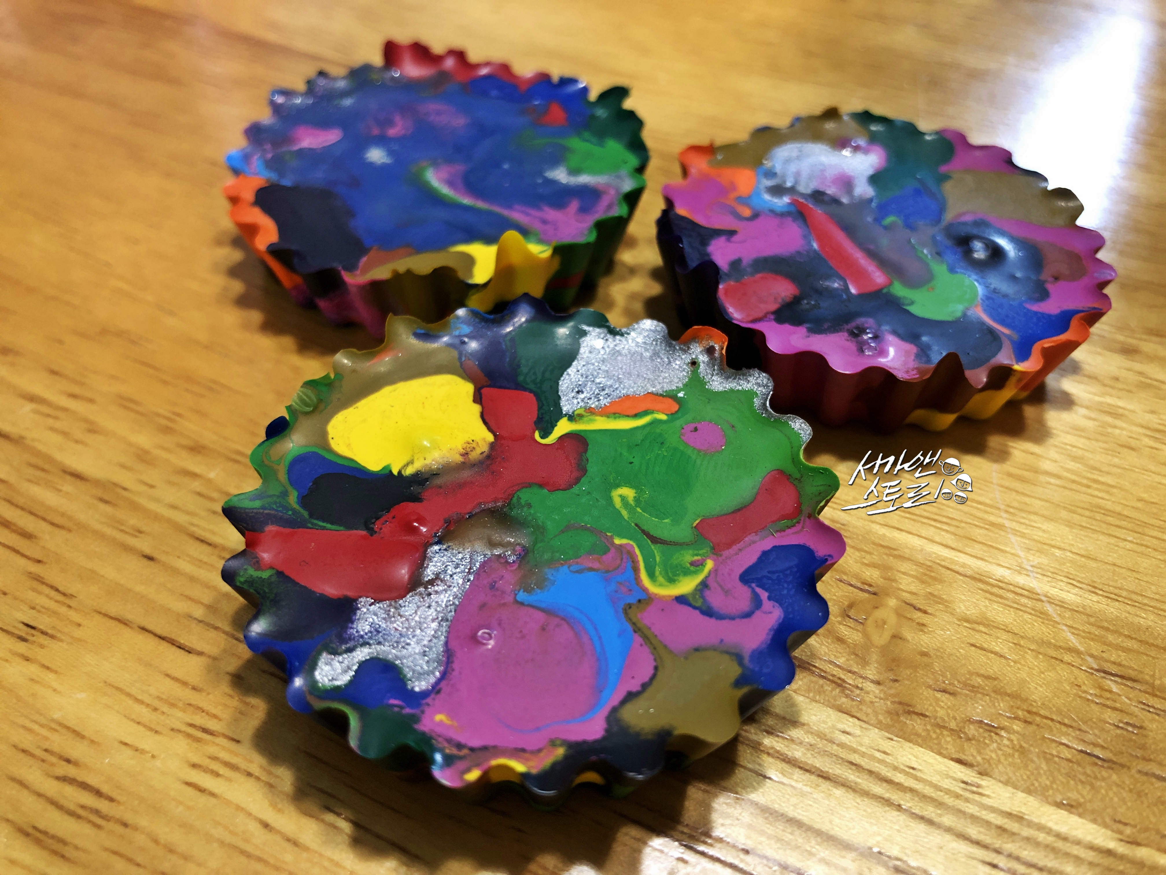 ↗실리콘 몰드에서 떼어낸 모습이예요. 여러 가지 색이 예쁘게 잘 섞이며 마블링이 만들어졌어요. 아래쪽과는 또 다른 모양을 보여주네요, 쓰레기통에 버려질 줄로만 알았던 부러진 색연필이 이렇게 다른 모양으로 바뀐다는 것을 함께 지켜 본 아이들이 정말 신기해 했답니다.