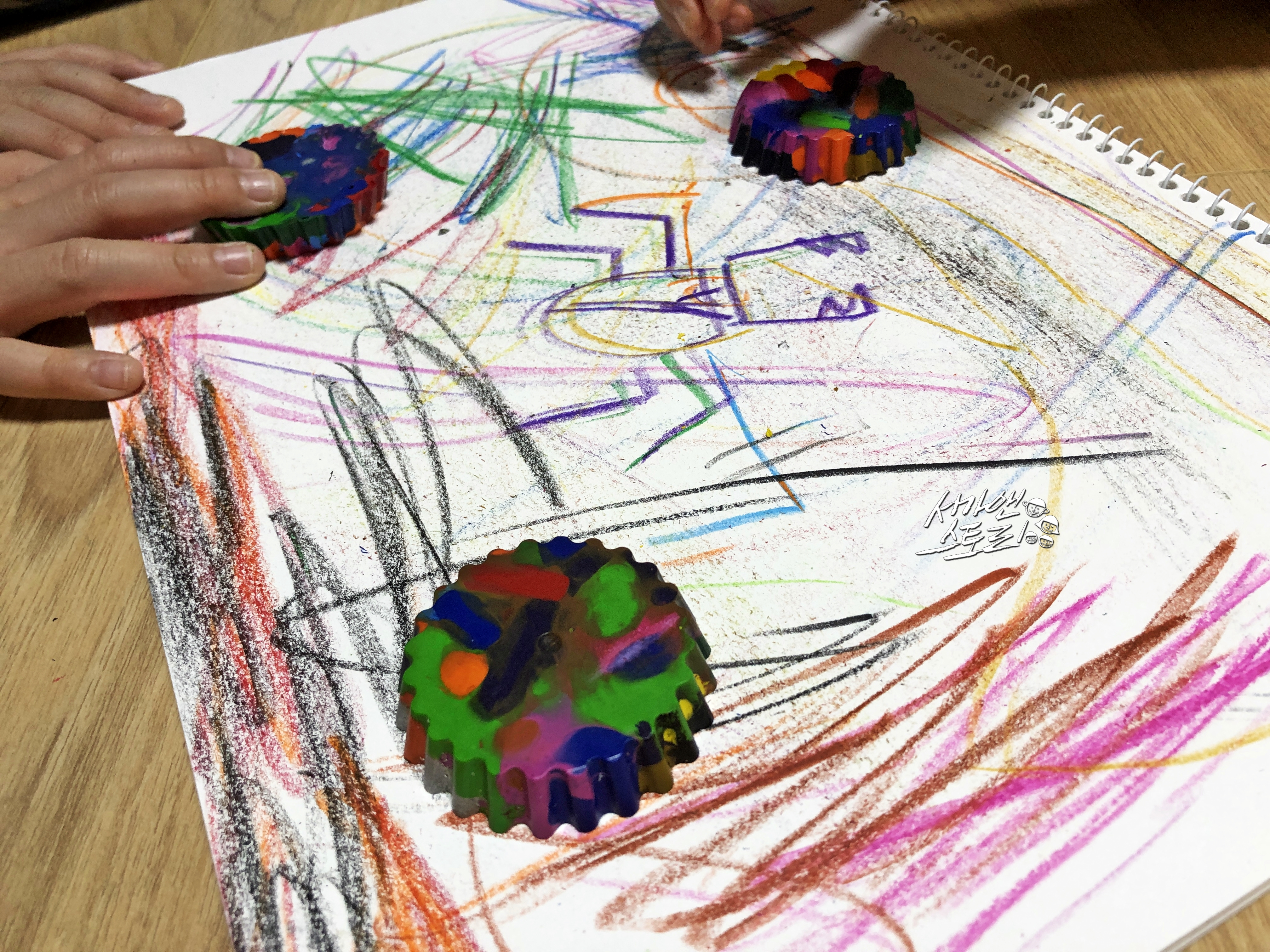 ↗이른 아침부터 스케치북을 펴서 덩어리 색연필을 이리 저리 문질러 보는 서가네 두 아이들, 여러 가지 색이 섞여 있어서 그리는 중에 색이 바뀌기도 하고 올록 볼록한 모양 때문에 여러 개가 함께 그려지기도 하고 길쭉한 막대 색연필과는 또 다른 매력이 있네요. 아이들이 쓰다 부러져버린 색연필, 너무 짧아져서 쓰기 불편한 크레파스 모두 모아 모아서 아이들과 함께 덩어리로 한 번 만들어 보시면 어떨까요? 아껴쓰는 법도 가르쳐 주고, 다른 모양이 될 수 있다는 것도 가르쳐 줄 겸 말이예요. 그리고 무엇보다 그걸 스스로 할 수 있다는 것도 알려주고 말이죠! 비록 힘들지만 아이들의 미소에 힘입어 모두 즐거운 육아 하세요!