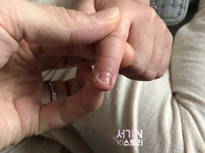 반대쪽도 마찬가지, 손톱들이 하얗게 들뜨기 시작해서는 안쪽부터 벗겨지고 있다. 이게 대체 무슨 일인가 싶어 알아보니 수족구후유증이란다. 수족구를 앓은지 한 달 뒤쯤 손톱이 다 빠질 수 있다고 한다. 큰 애 때는 이런 일 없었는데 이게 뭔 일인지!