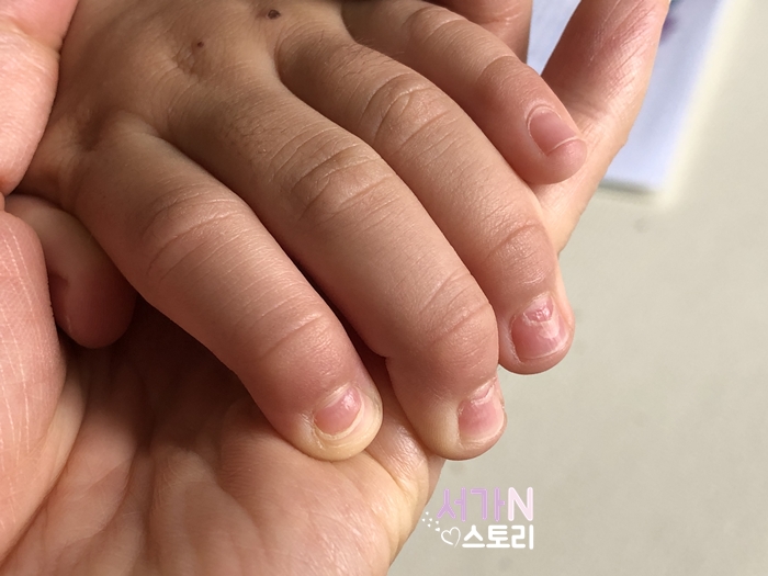 반대쪽도 마찬가지, 손톱들이 하얗게 들뜨기 시작해서는 안쪽부터 벗겨지고 있다. 이게 대체 무슨 일인가 싶어 알아보니 수족구후유증이란다. 수족구를 앓은지 한 달 뒤쯤 손톱이 다 빠질 수 있다고 한다. 큰 애 때는 이런 일 없었는데 이게 뭔 일인지!